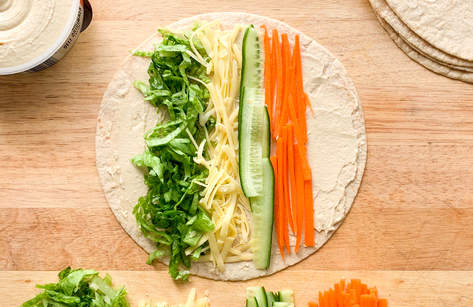 Sushi style wraps are a fun take on a simple cheese and salad wrap. They’re easy for little hands to eat and interesting enough to keep the big kids happy too. Hummus is a nutritious alternative to butter providing less fat but more protein and fibre.
